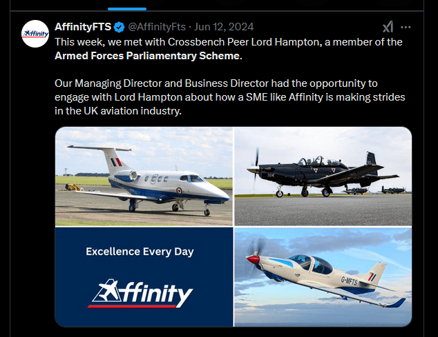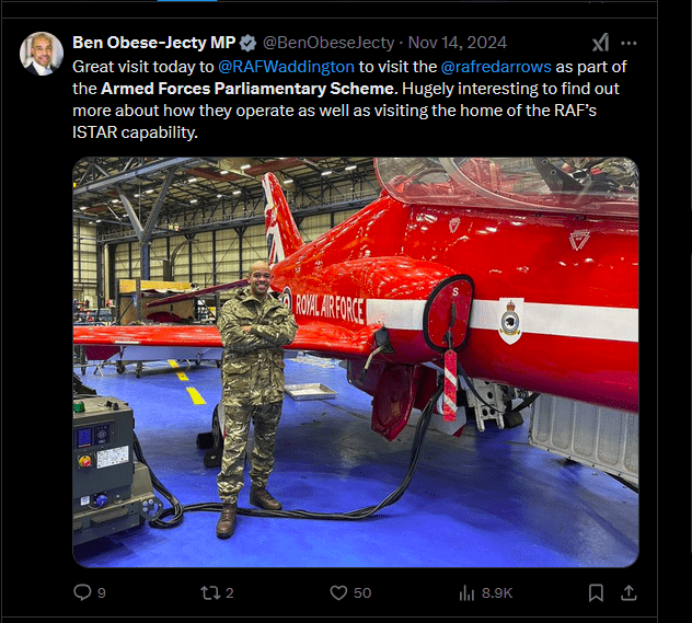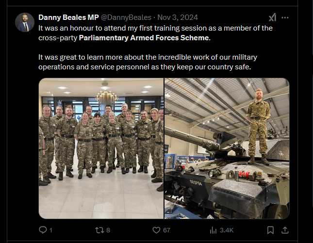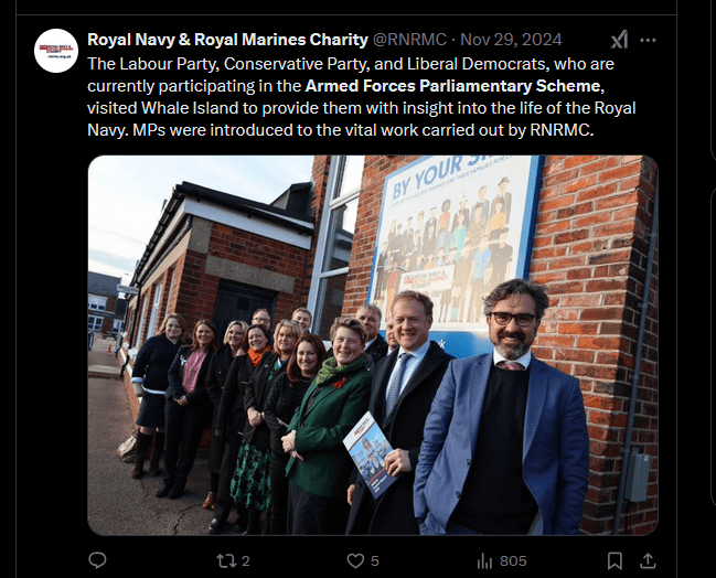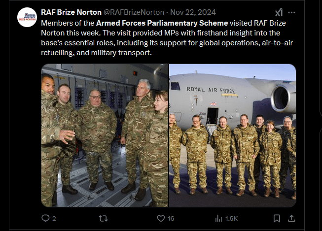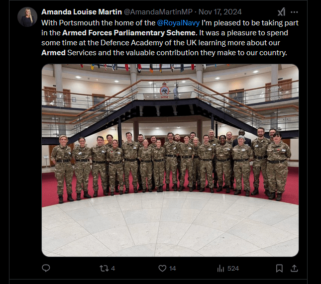 What becomes clear from reading these job adverts is the way in which the military views the AFPS as a way to influence Parliamentarians and employs full-time staff to do this – which is a far cry from the passive presentation of the Scheme as a way for MPs to better understand the day to day life of rank-and-file armed forces personnel. One indication of how this might work in practice comes from an X post from Vikki Slade in November 2024, in which the Liberal Democrat MP states: