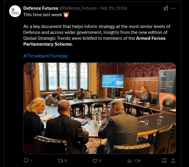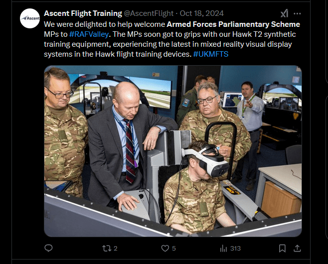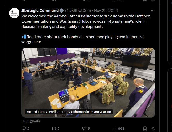 In November 2024, the UK’s Defence Academy posted on X that the Armed Forces Parliamentary Scheme (AFPS), which is run by the Armed Forces Parliamentary Trust, has returned with a record number of participants. At just shy of 60, this means almost one tenth of the House of Commons is currently participating in an arms industry funded military cosplay fantasy that, as we highlight below, is seen by UK Strategic Command as a way to influence MPs. This is an 80% increase on the 33 parliamentary ‘graduates’ from the Scheme in 2023-24.
