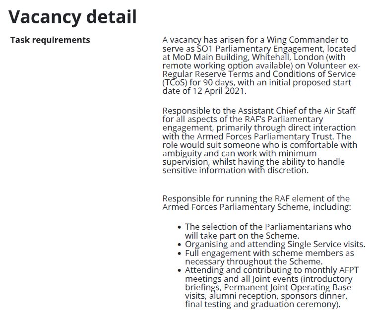 Another interesting insight comes at the end of the generalised advert, under the heading ‘Employer Comments’. It is stressed that the post holder must ‘develop their understanding of the Parliamentary audience’, ‘offer a platform to UKStratCom senior leadership to inform and influence key audiences’ and ‘will have close, regular professional and social interactions with Parliamentarians’ through their AFPS work.